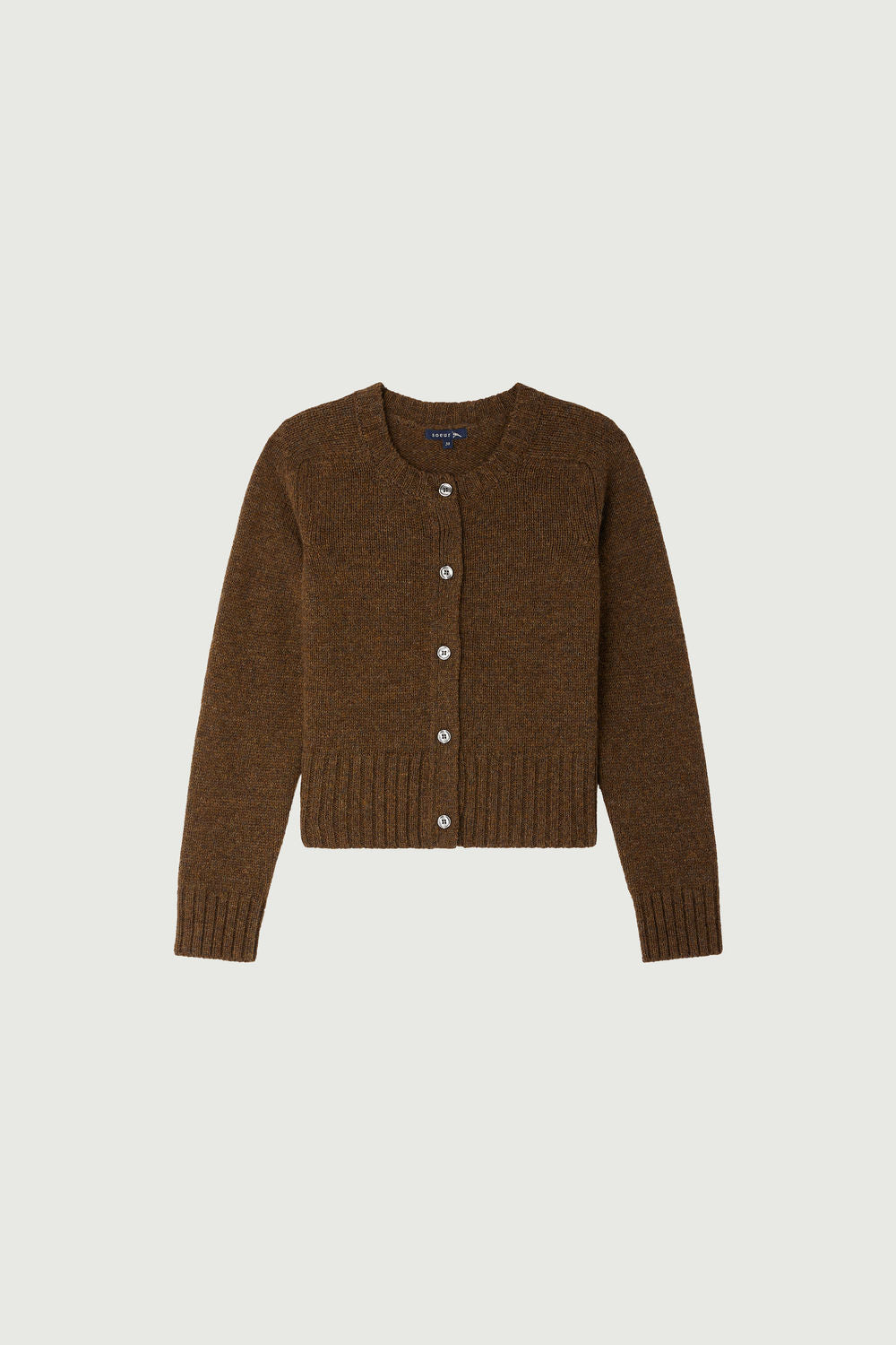 LYNE is a mixed wool cardigan. The ribbed hem finishes at the bottom and on the sleeves enhance its slim, close-fitting silhouette. A grosgrain ribbon runs along the button placket. It is knitted in a signature Soeur knit with a fluffy texture (long Alpaca wool fibres).